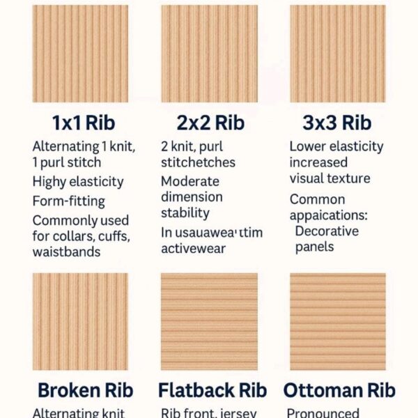 Rib knits, like 1×1 or 2×2, vary in elasticity and texture. They are essential for cuffs, collars, and fitted garments. Broken rib and flatback rib add design versatility, blending structure with comfort.