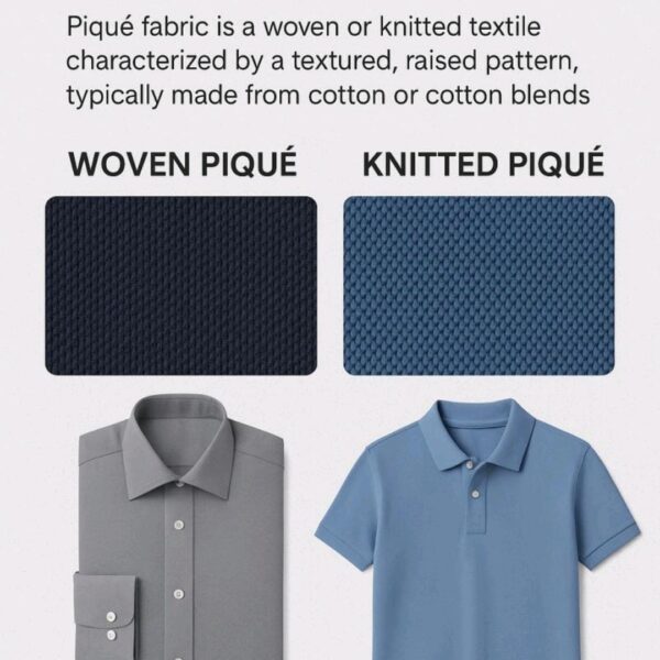 Piqué is a textured fabric, woven or knitted, often used in polo shirts and tuxedo shirts. Its raised patterns add durability and breathability, making it a popular choice for formal and casual wear alike.