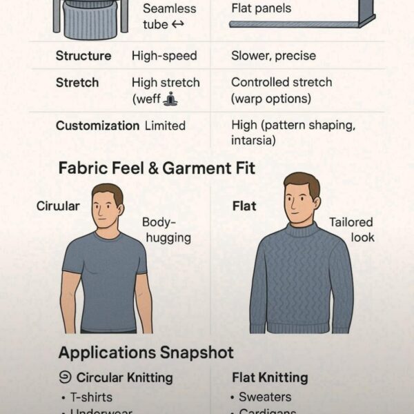 Circular knitting produces seamless tubes, ideal for activewear and socks. Flat knitting creates structured panels for sweaters and cardigans. The method chosen impacts stretch, customization, and production speed.