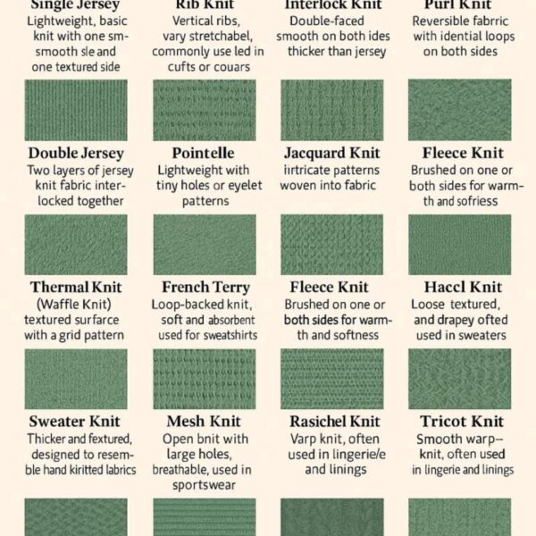 From single jersey to cable knit, each type offers distinct textures, stretch, and applications. For instance, rib knit is perfect for cuffs, while fleece provides warmth. This variety allows for innovation in sportswear, fashion, and functional apparel.
